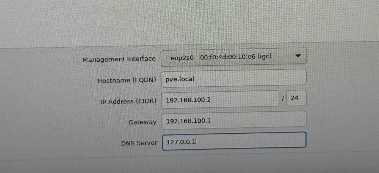 之后一路选择默认即可,遇到下面这个不要把 192.168.100.x 改为 192.168.1.x,默认即可。血的教训,这里的网段不可以和光猫/CPE 网段一样,正常是 192.168.1.x,所以不要改为这个。 Hostname 只是域名,随便改。